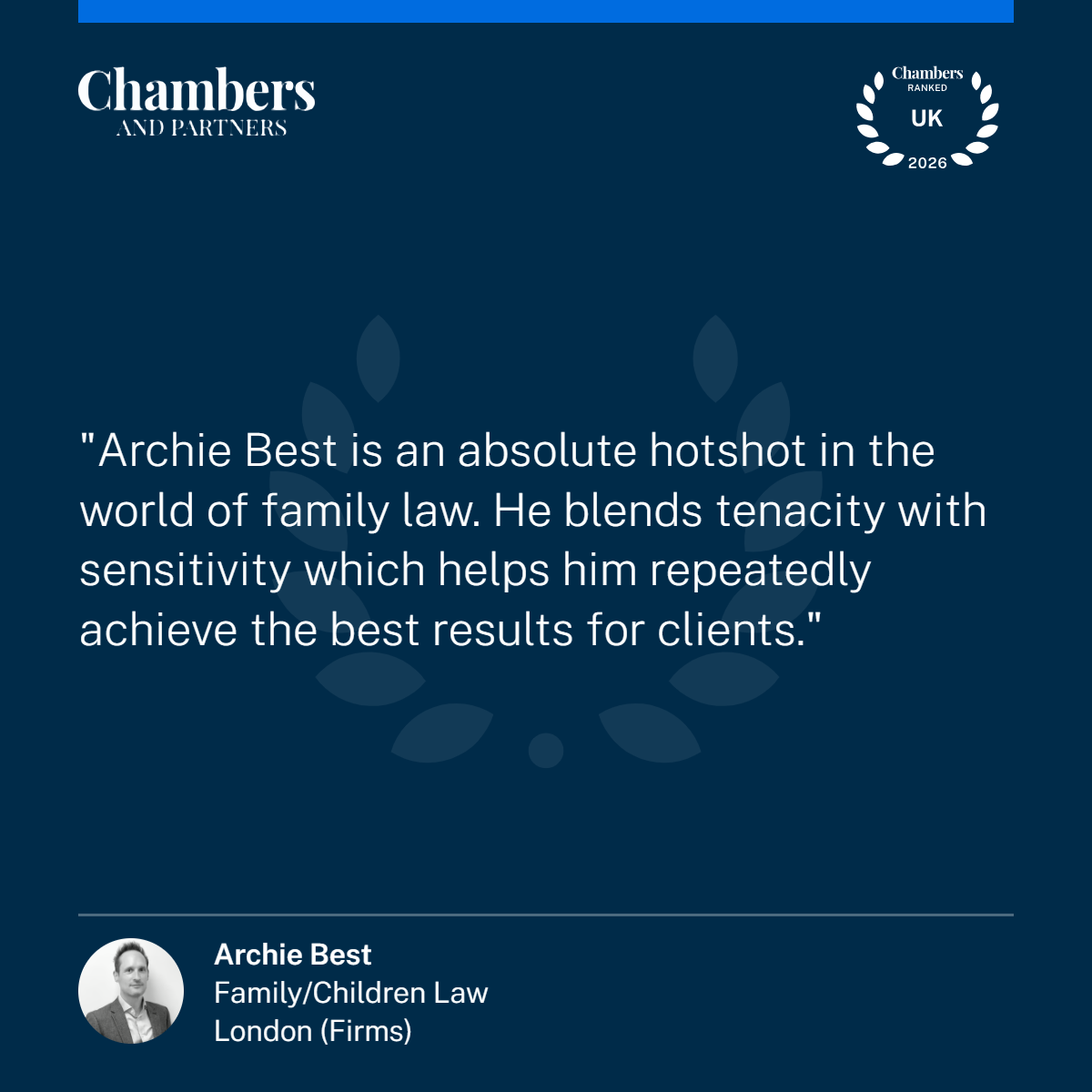 The Chambers 2026 Family/Children Guide says the following about Archie: “Archie Best is just a brilliant family lawyer and has an excellent bedside manner. He is a natural adviser, great at telling the black letter law and what people need to know“; “Archie Best is an absolute hotshot in the world of family law. He blends tenacity with sensitivity which helps him repeatedly achieve the best results for clients” and “I would recommend Archie to anyone who needs a very intelligent, experienced and no nonsense but empathic solicitor. His extensive knowledge of the law is impressive and very reassuring